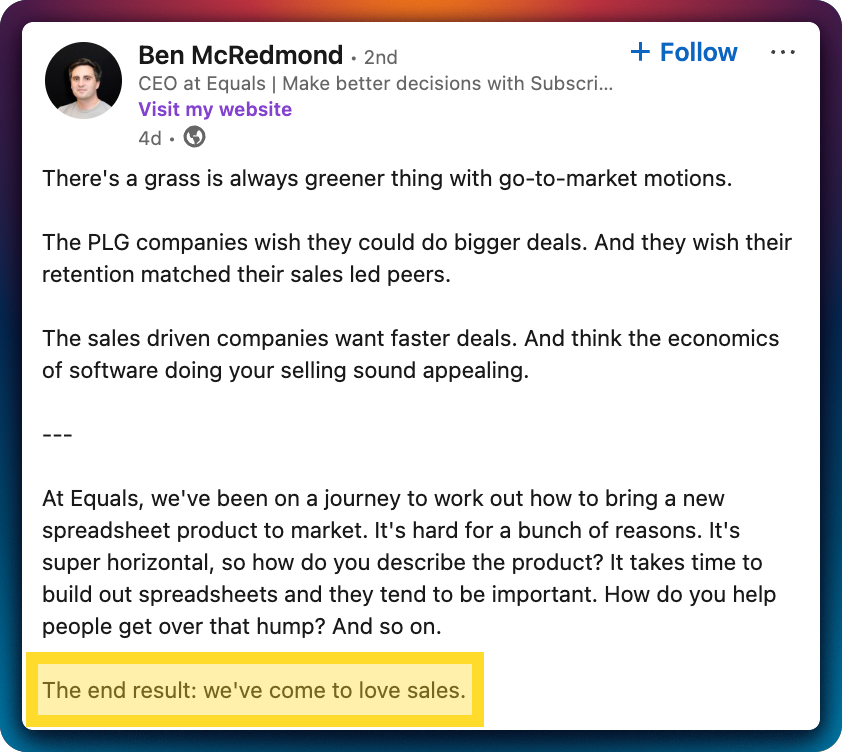 More than another blog post or witty LinkedIn wisdom, I have to go hunt for customers we can help. Sales has to be more than ok. It has to be the biggest and best part of my day until we have the momentum to carry us into another growth motion like PLG.